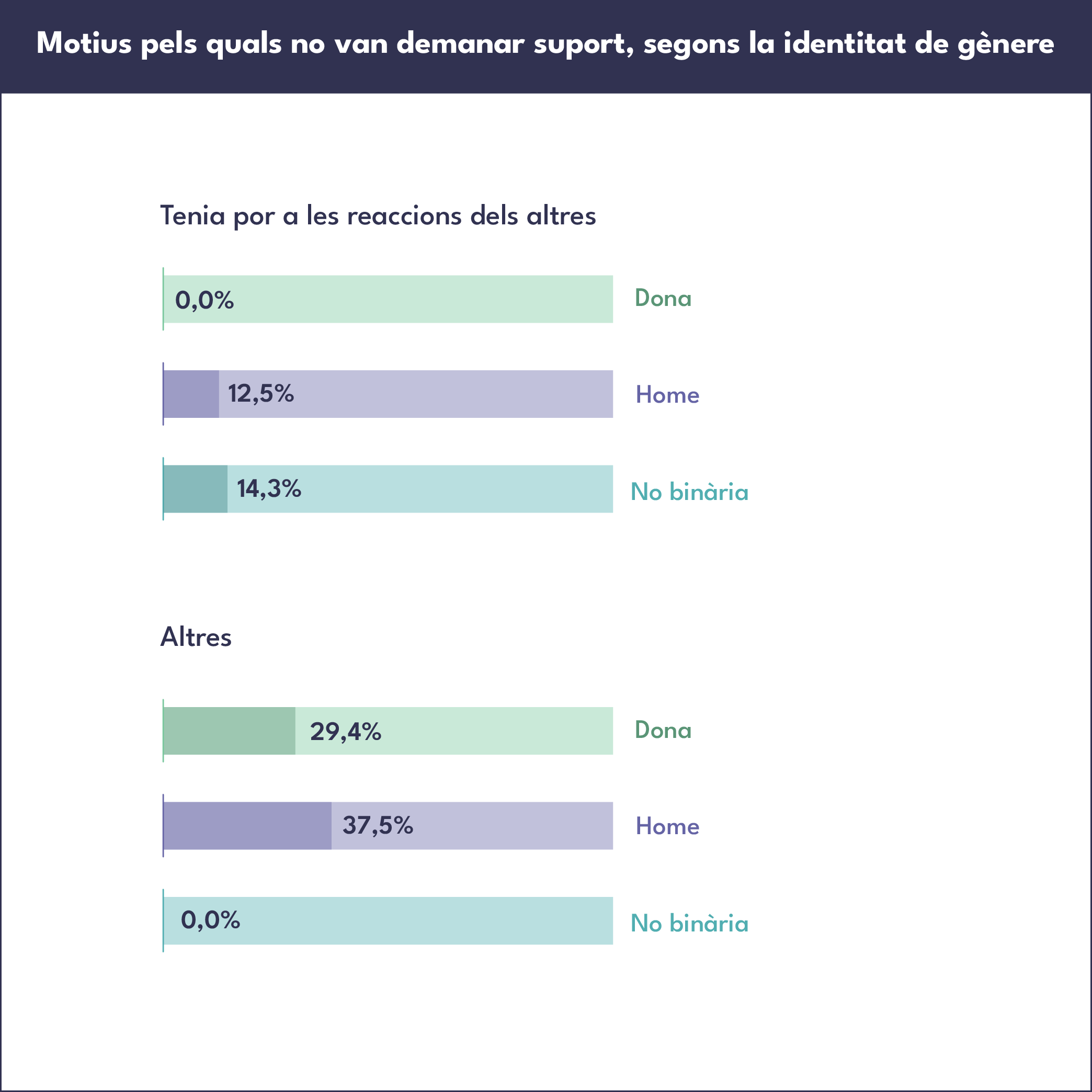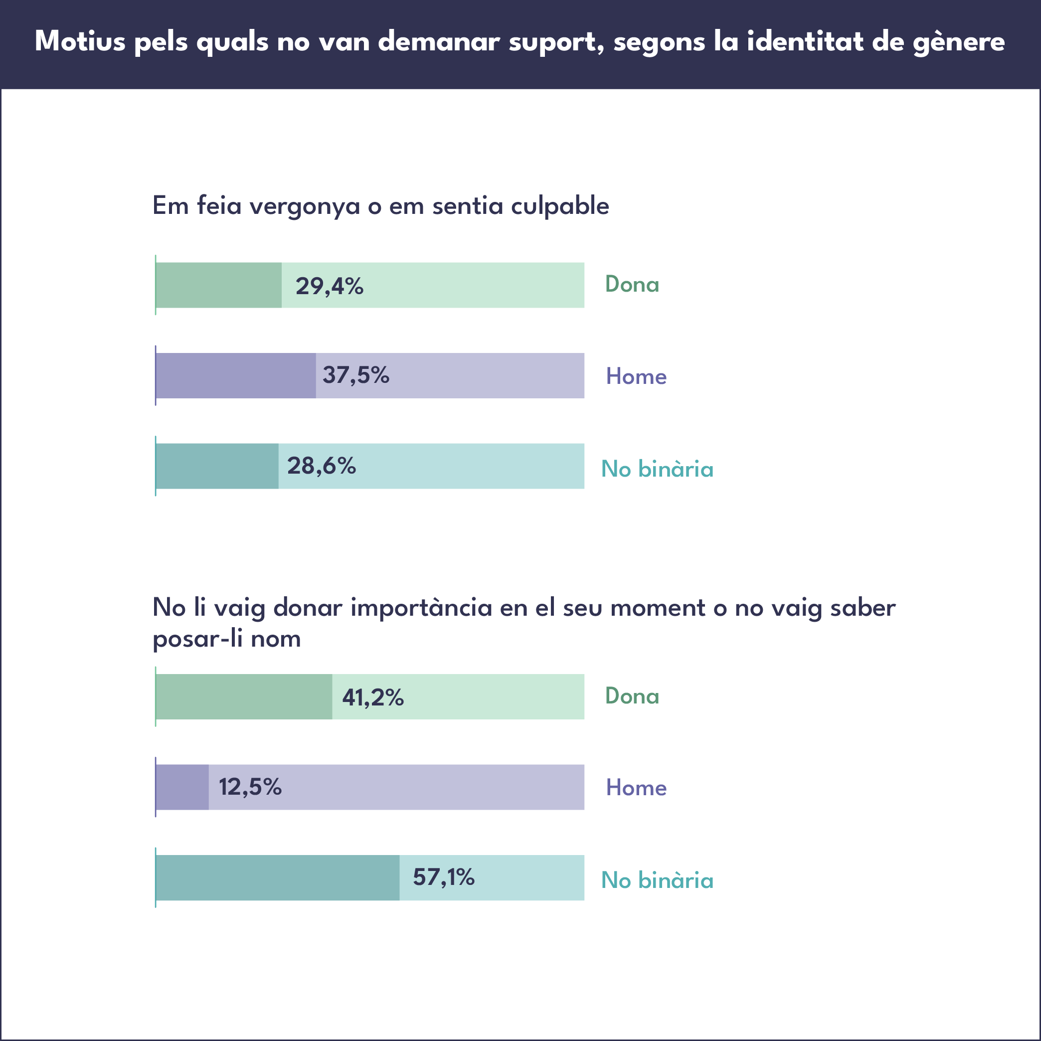El discapacitisme estructural contribueix a invisibilitzar les violències masclistes i sexuals que puguin patir les persones amb diversitat funcional, la qual cosa suposa una important barrera per a l'acompanyament i reparació d'aquestes violències. Els hem preguntat a les persones que van afirmar haver viscut situacions de violència sexual si van demanar suport; si el van rebre en cas d'haver-ho demanat i, si no ho van fer, per quins motius.