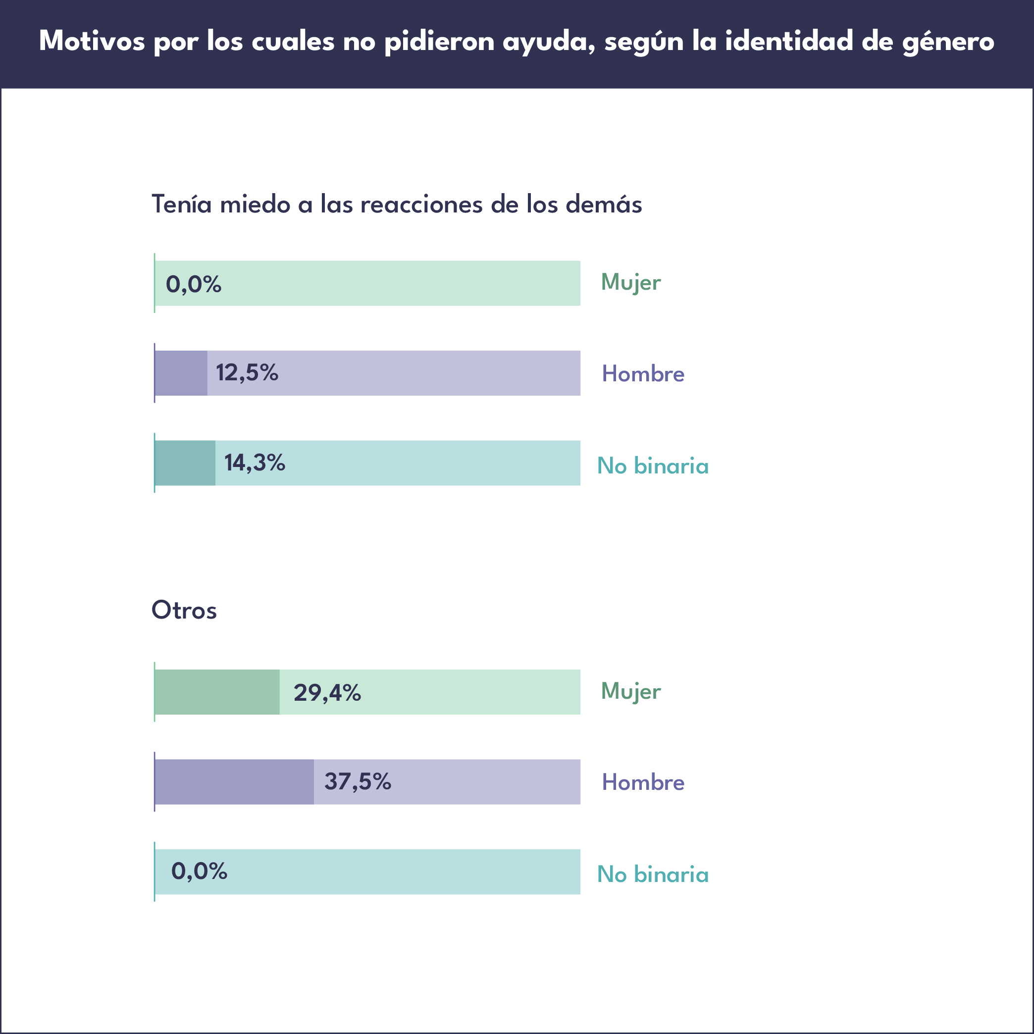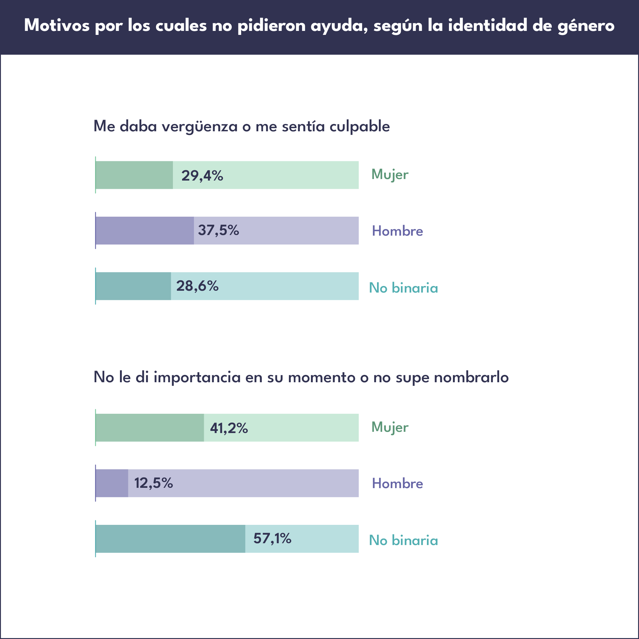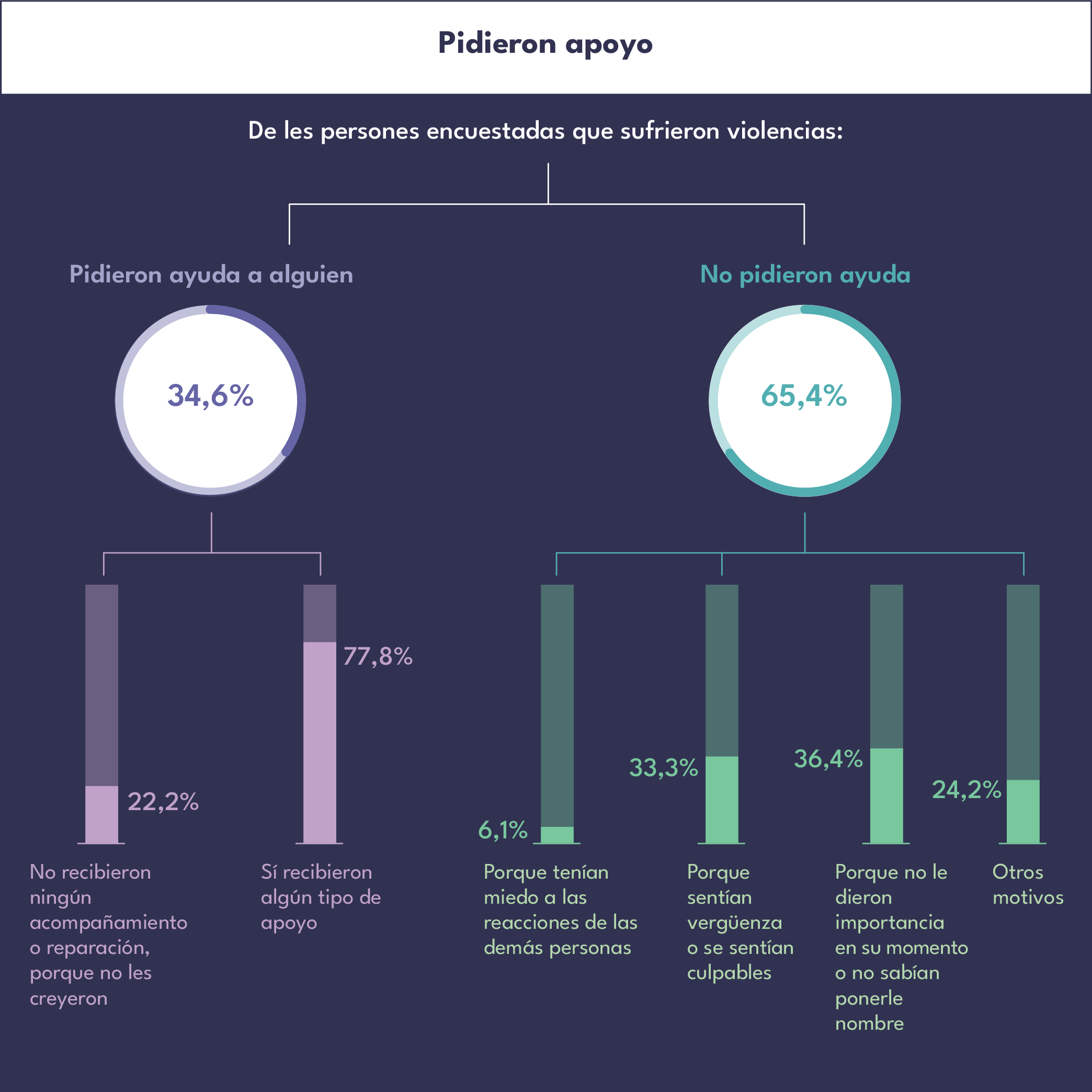 El discapacitismo estructural contribuye a invisibilizar las violencias machistas y sexuales que puedan sufrir las personas con diversidad funcional, lo que supone una importante barrera para el acompañamiento y reparación de estas violencias. Les preguntamos a las personas que afirmaron haber vivido situaciones de violencia sexual si pidieron apoyo; si lo recibieron en caso de haberlo pedido y, si no lo hicieron, por qué motivos.