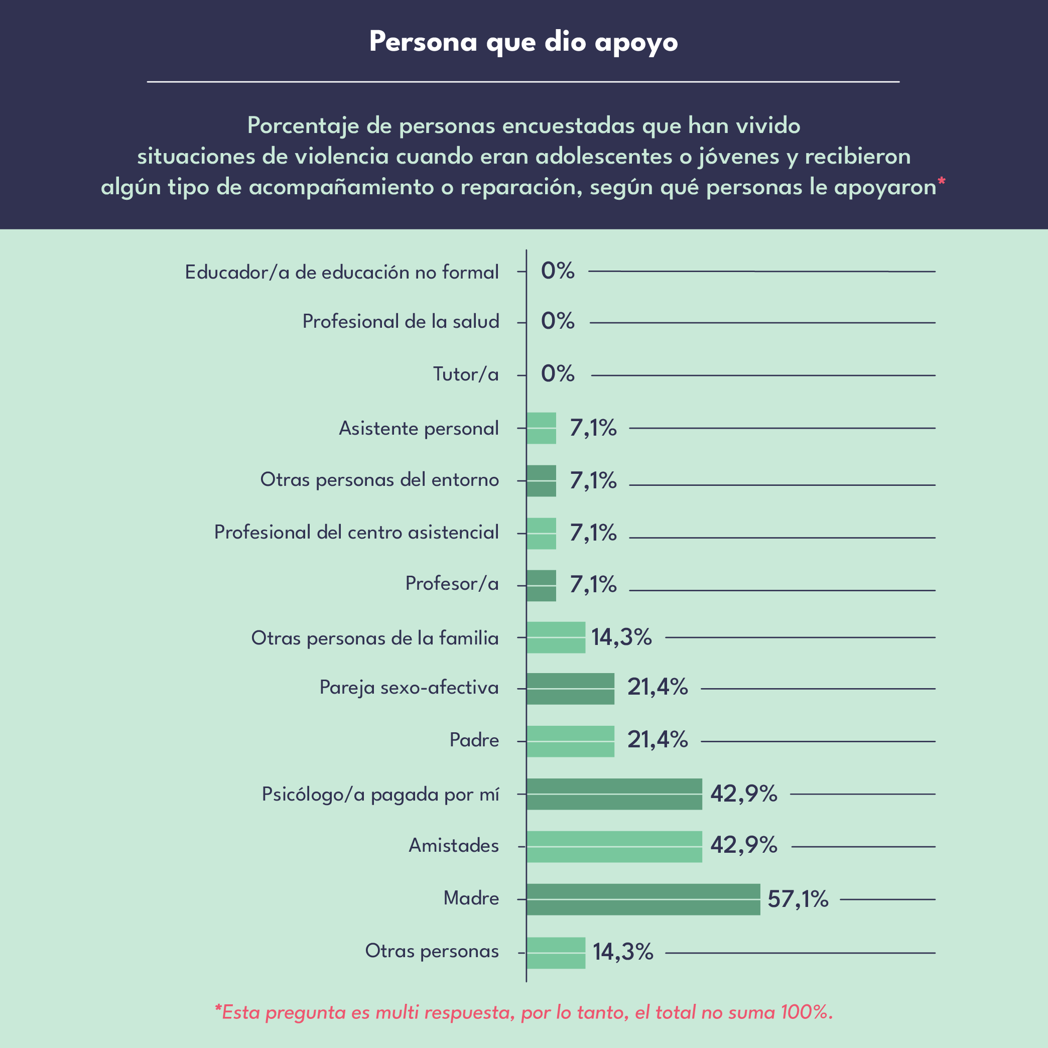 En más de la mitad de los casos, la persona que dio apoyo fue la madre. Le siguen las amistades y una persona psicóloga de pago. Profesionales de la salud, educadores sociales o tutores no fueron la persona de apoyo en ningún caso.