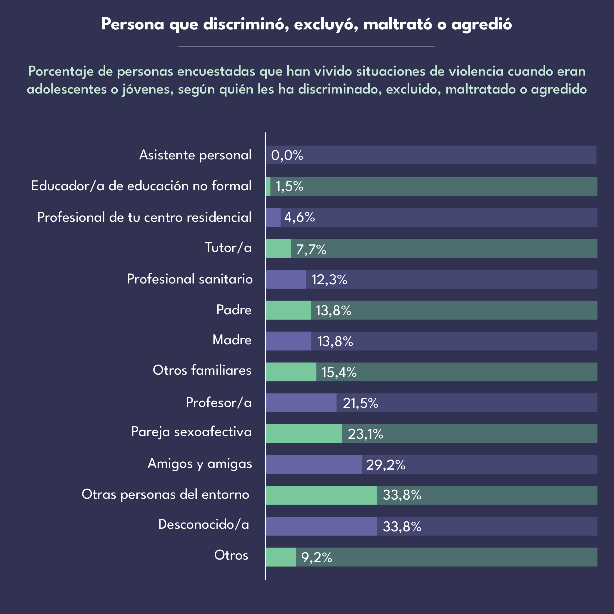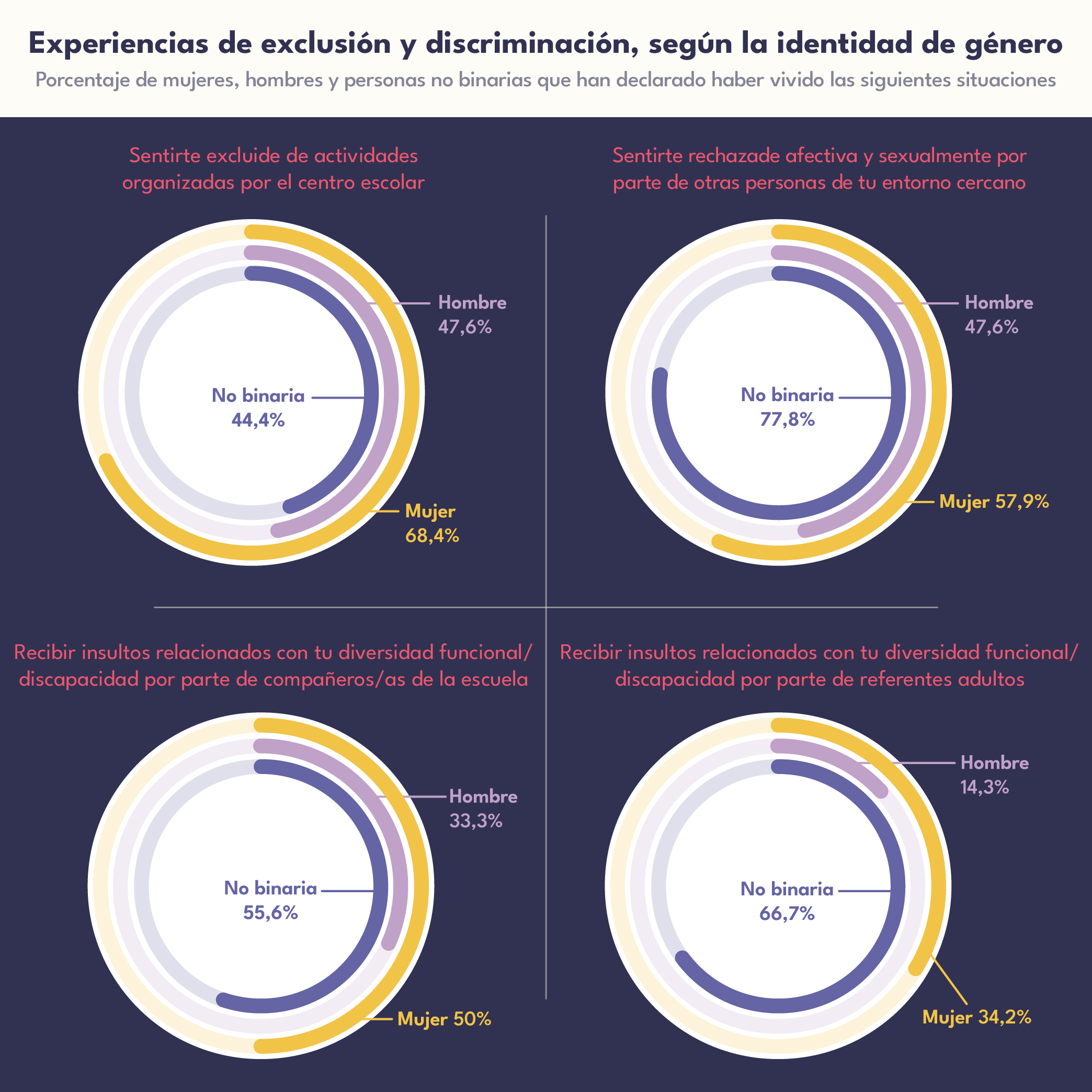 En la encuesta, hemos querido recoger formas específicas de violencia hacia cuerpos con discapacidad, diskas o con diversidad funcional, ya que estas violencias, por un lado, reflejan la desigualdad y, por otro, condicionan las experiencias en los contextos donde se imparte educación sexual.